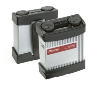 The Acrobat Wireless Beltpack is a light and compact, digital headset station with two individually configurable channels for intercom and IFB use. Operation is intuitive and follows the concept of Riedel’s Performer C3 Digital Partyline Beltpack. Two large rotary level controls on top of the beltpack combine the talk-key and volume-control for each channel. Turning the controls adjusts the listen volume, pushing the controls toggles talk on/off with momentary or latching operation.